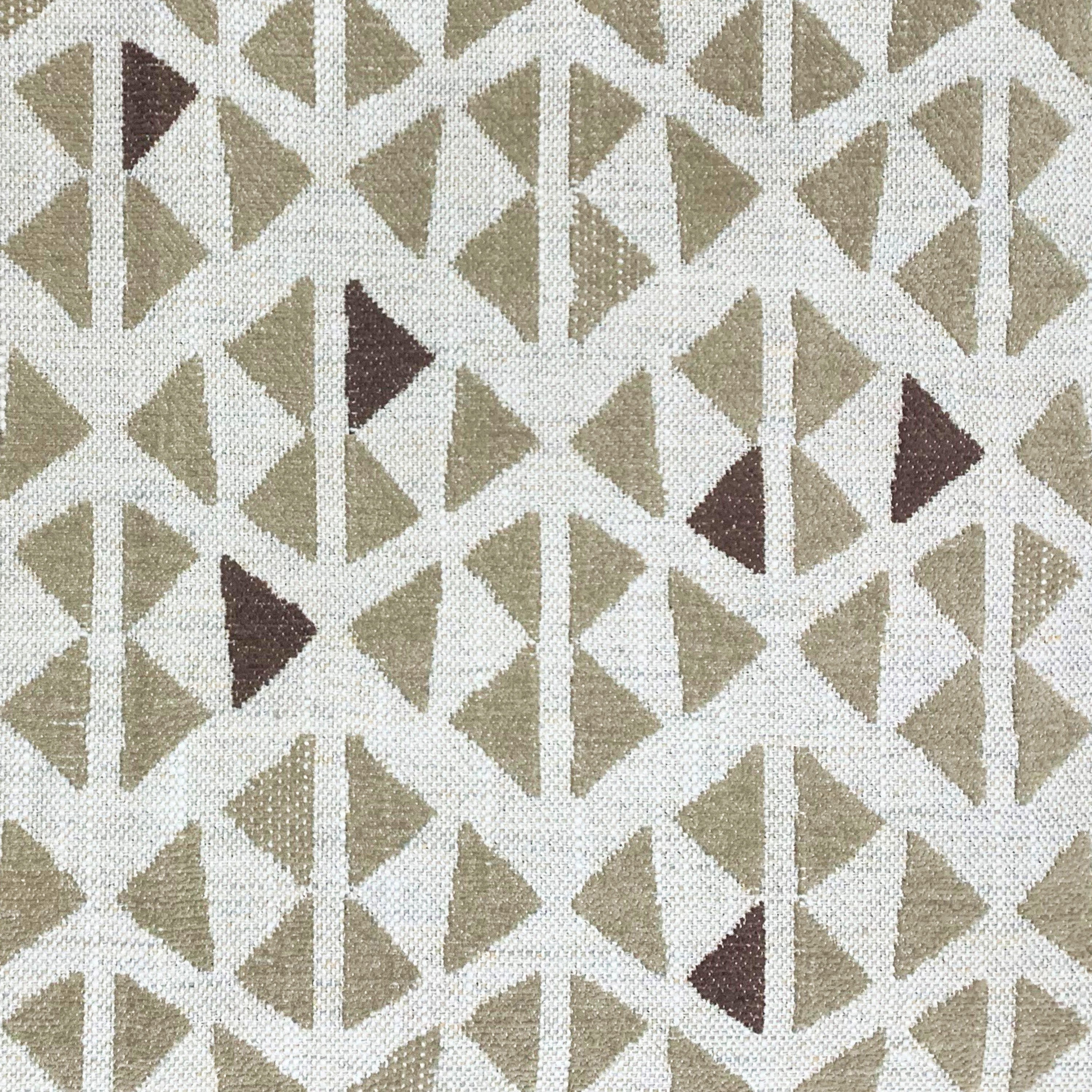 A woven fabric with a crisp geometric pattern of interlocking triangles in soft mineral tones, set against a light natural background.